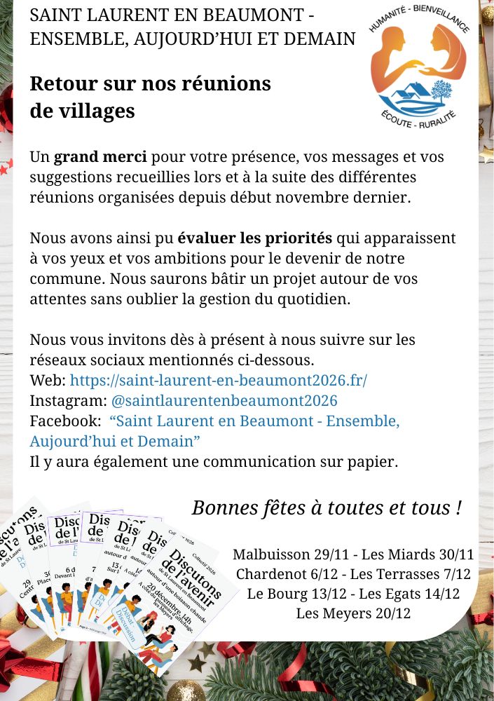 Ce 6 janvier 2026, symbole de renouveau et d’Universalité, marque une nouvelle étape de notre communication. Depuis novembre dernier, nous vous avons invité, en effet, à échanger au cœur de chacun des nombreux villages qui composent notre commune. Nous saurons tenir compte de vos nombreux messages et vous en remercions.